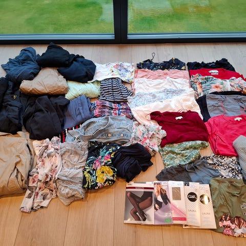 28 plagg. Mange kjoler, en jeans, et par skjorter og cardigans, trøyer. Hovedsakelig H&M, men også overdeler fra Pierre Robert med Jenny Skavland.