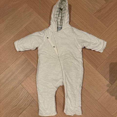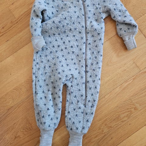 Polarn O. Pyret vinterdress for barn i størrelse 68. Dressen er grå og fôret med myk, varm fleece. Dobbel glidelås for enkel påkledning og hette for ekstra beskyttelse. Fôret kan brettes over hendene som en vott.