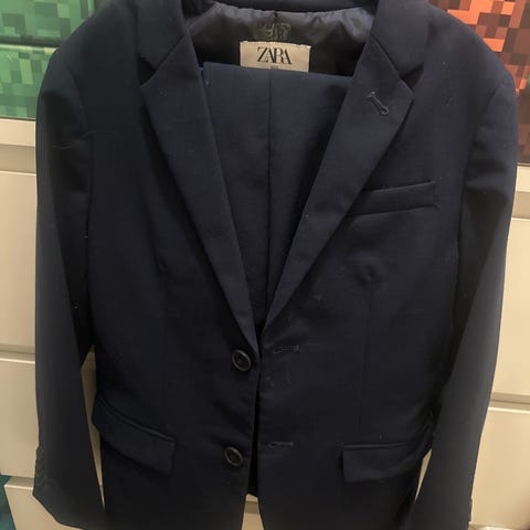 Mørkeblå dress fra H&M. Inneholder dressbukse, blazer, vest, langermet hvit skjorte og kortermet hvit skjorte. Mix og match de ulike delene til ulike årstider og anledninger. Har kun vært brukt ved to anledninger før det dessverre ble for lite. Som nytt. Fra røykfritt hjem uten dyr.