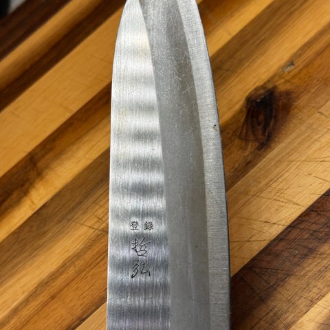 Importert kjøkkenkniv fra Japan. Type Gyuto. Kniven er brukt på profesjonelt kjøkken og har en egen Ju-ju som bare må oppleves. Her er det mye svette og blod som har satt sitt preg på bladet.