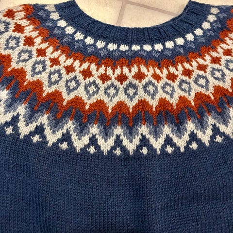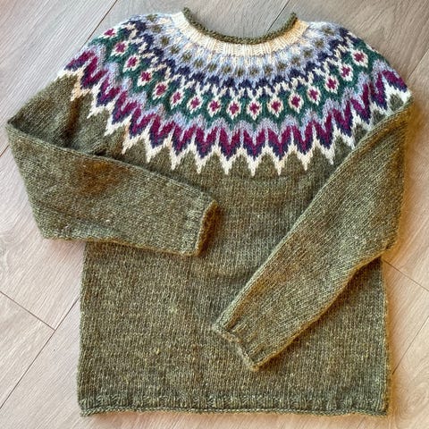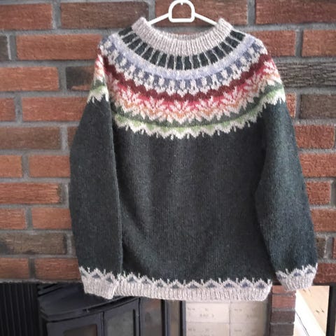 Ny, håndstrikket Fjordblå Riddari-genser strikket i Lettlopi, 100% ull, selges. Garnet er kjent for sin luftighet og isolerende egenskaper.