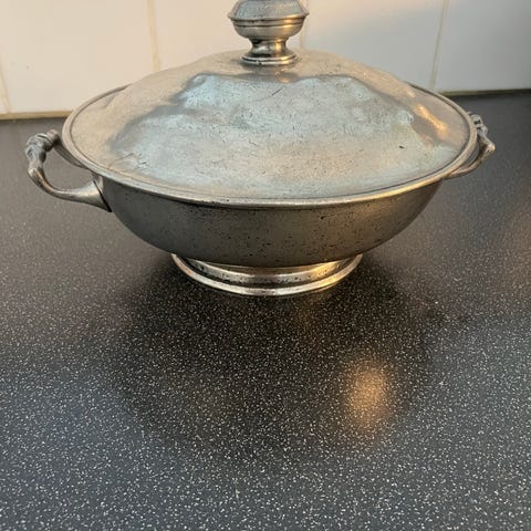 Denne er kjøpt i Sverige på en reuse butikk. I sommer kjøpte jeg 4 kanner til 2000 samlet. De så ikke ut og jeg trodde ikke jeg kom til å få de pene. 3 av de er i helt utsøkt stand og har ingen skader eller bulker. De trenger bare litt mer puss og tolmodighet. Da de tydelig hadde blitt glemt bort