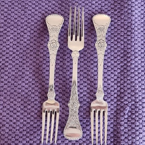 Gamle/vintage Prima Nysølv ALP kakegafler selges. Jeg vet ikke alder på disse, men tror de er ganske gamle. De er merket Prima NS ALP 12. NS står vel for Nysølv. De er i god stand. De er ca 14 cm lange.