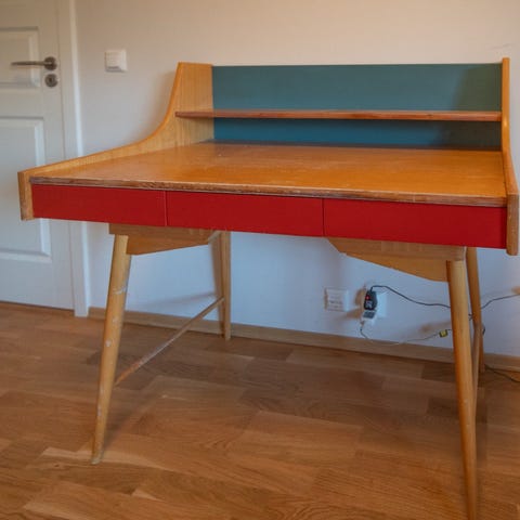 Retro Ola-pult i originale farger selges. Den har bruksmerker i bordplaten, samt oppi skuffene. Bena er skrudd av for enklere henting og transport.
