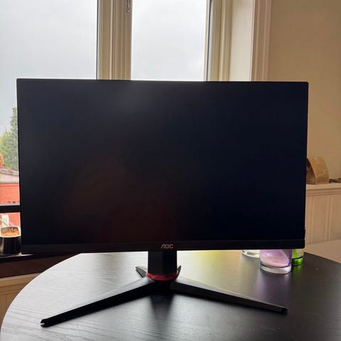 AOC 24 tommer skjerm med buet design. Skjermen har en oppløsning på 2560x1440 piksler og har blitt brukt til gaming.