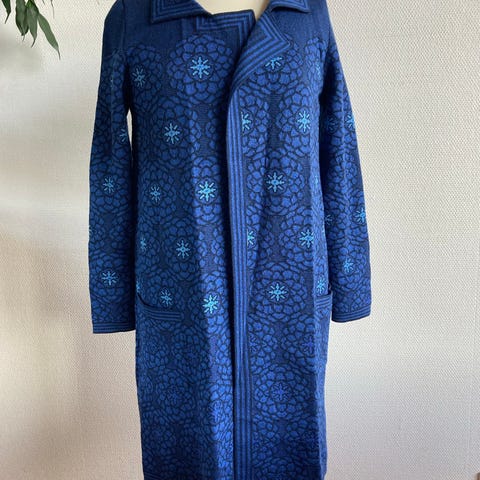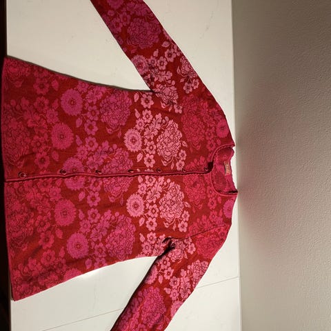 Oleana Cardigan i flerfarget i 75 % merinoull/ 25 % silke i størrelse XL for kvinner. Cardiganen har et mønstret design og er laget av merinoull, som gir varme og komfort.