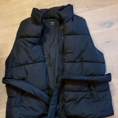 Jakken har pelsdetaljer på krage og ermene, de er avtagbare. Materialet er kunstig skinn. Jakken viser tegn på slitasje på ermet. Se bilder. Selges derfor billig.