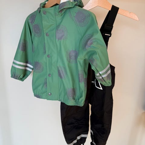 Fint brukt xplor regnsett str 2 (86/92). Ikke foret. Lite bruksmerke bak på rumpen, men har ikke å si for bruken. Ingen hull eller andre anmerkninger. Godt med refleks både på jakken og buksen. Avtagbar hette. Vanntett. Har justerbar fotstrikk som enkelt kan byttes ut ved slitasje.