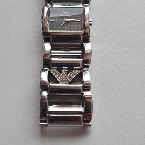 Swatch dame klokke med firkantet urskive i sort og metallisk armbånd. Klokken har et moderne design med detaljer i sølv og gullfarge på armbåndet. Passer for kvinner og har en justerbar lenke for tilpasning til håndleddet.