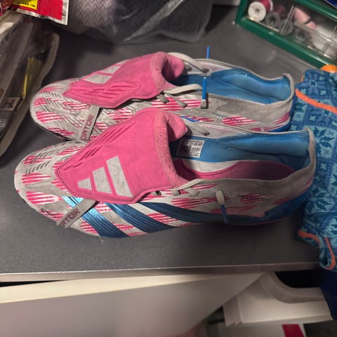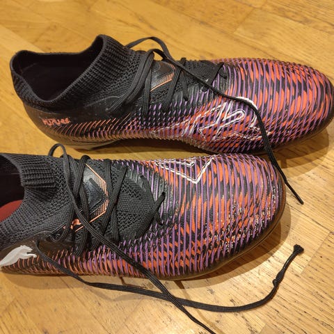 Puma fotballsko i størrelse 44 med gul og oransje farge. Skoene har knotter på undersiden for bedre grep på gressbaner. Egnet for bruk ved fotballspill.