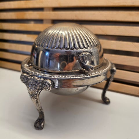 Vet ikke om lokk og kar hører sammen originalt. Er noen nag på kanten av glasslokket.