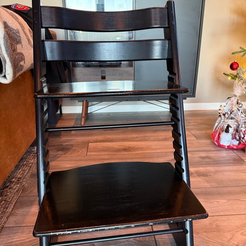 Stokke Tripp Trapp høy barnestol i blå farge. Barnestolen er laget i tre og har justerbar sitte- og fotplate for tilpasning til barnets vekst. Designet for barn og gir ergonomisk støtte ved måltider og lek. Passer alt av Stokke tilbehør.