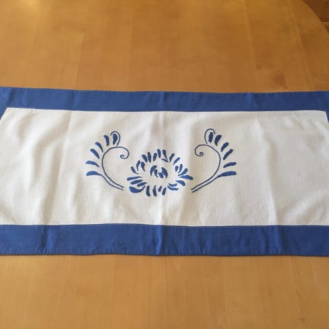 Selger 2 lengder «linaktige»mørkeblå gardiner. Tøyet er i polyester.