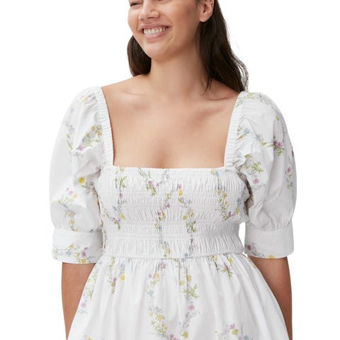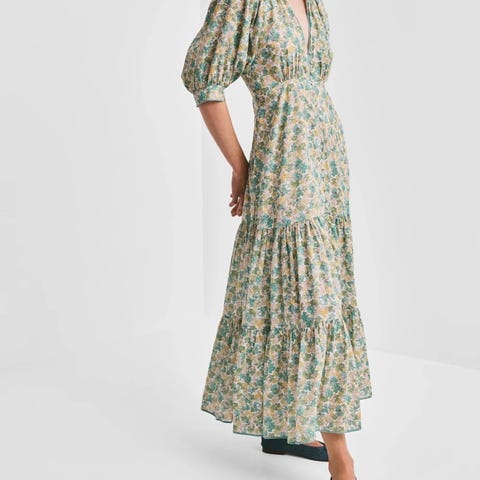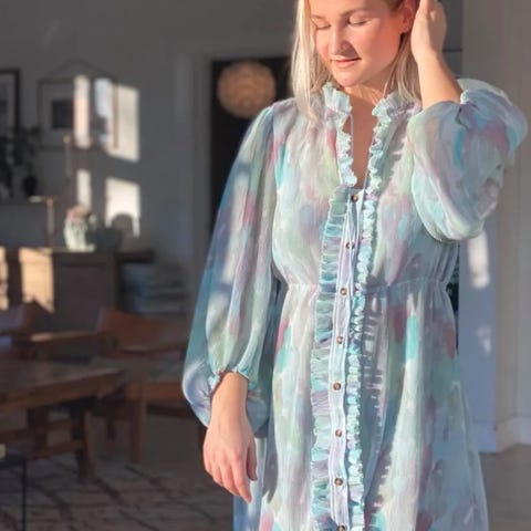 I fargen floral azure blue. En superfresh sommerkjole som nå fortjener et nytt hjem! Store puffermer og strikk i livet. Strl 38, normal til stor i størrelse. Kan ikke finne noen anmerkninger. Noen bilder lånt.