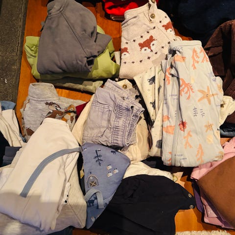 Inneholder blandt annet en nydelig jakke med gravemaskin fra Name it, pysj og body i bambus fra Hust & Claire, gensere, fleecegensere + bukse, ullbukser, Mikke Mus genser og bukse etc