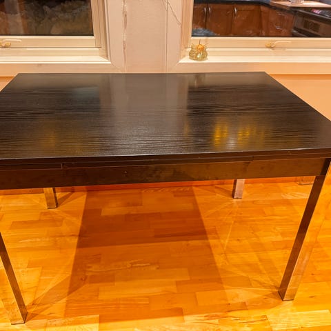 Spisegruppe fra IKEA i god stand. Inkludert 4 stoler og ekstra plate i bordet som ligger fast under bordet. Kan hentes i Bergen sentrum. Bordet er 125x85cm. Med ekstra plate er bordet 163x85cm. Høyden er 75cm.