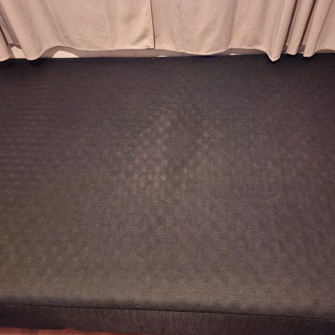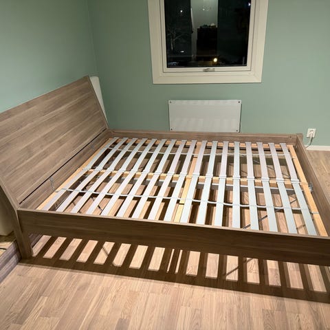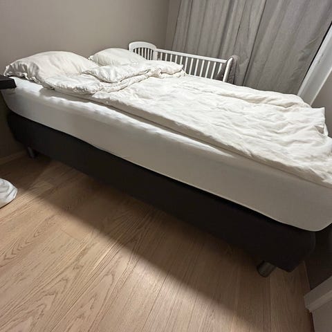 En pent brukt dobbelseng, med 138 cm høy sengegavl . Mørk grå velur/ fløyelstrekk på hele senga og sengegavlen. Hyllestad medium madrass 180x200. Trekket på sengegavl har fått en bleket flekk venstre side. Manual følger med. Gis bort mot å hentes.