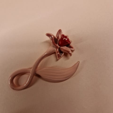 Årets sløyfe er laget av metall, sink som hovedbestanddel i kombinasjon med andre metaller. Den rosa stenen er krystall.