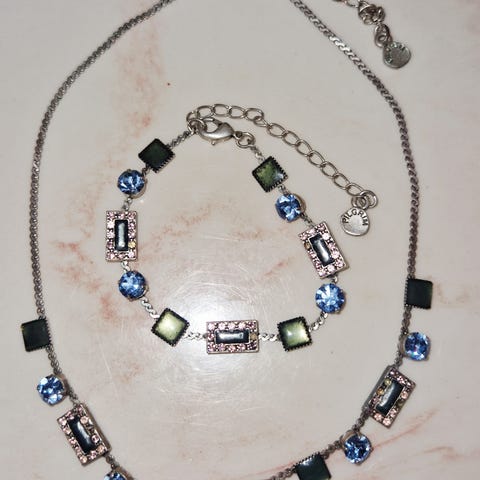 Pilgrim smykkesett, laget av sølvbelagt materiale med emaljert og krystalldetaljer.