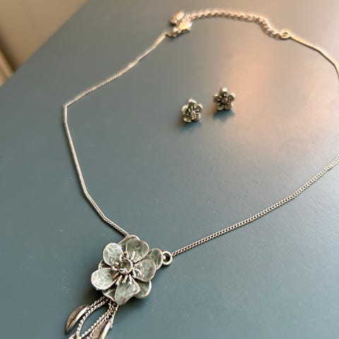 Settet inkluderer halskjede og øredobber med blomster- og sommerfugldesign.
