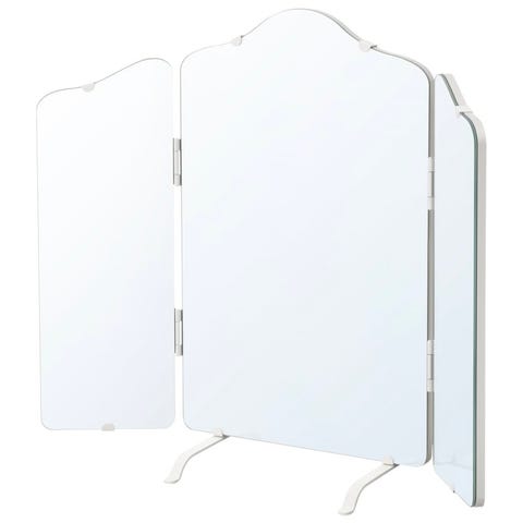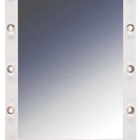 IKEA North sminkespeil med innebygde lys rundt kanten. Speilet har en ramme i hvit farge og måler 46 x 36 cm. Designet for bruk på bord eller vegg, egnet for baderom eller sminkerom.