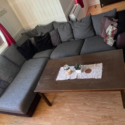 Sofaen er pent brukt, men den har en flekk.