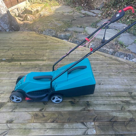 Elektrisk snøfreser i blå farge. Utstyrt med håndtak for enkel manøvrering og en utløpskanal for snø.