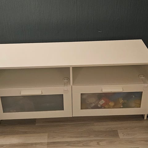 Meget solid og elegant møbel i heltre med stålben. Laget på svensk møbelsnekkeri i 2007. Ingen merker i treverk men stygge lim-rester og noe avskallet maling på venstre og høyre ytterdør. To hull for ledninger i midtre del, og lufting i hele møbelet i bakkant. Ved maling av dører vil det fremstå som nytt og elegant skandinavisk minimalisme. Vi elsker den :-) Men gir bort grunnet flytting, den passer ikke i vår nye leilighet.