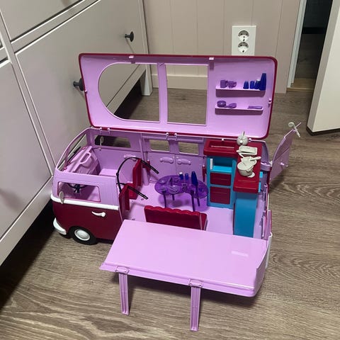 Barbie Dream Camper lekesett inkludert campingbuss, klesskap, flere Barbie-dukker og tilbehør som møbler og klær. Settet har en rosa campingbuss som kan åpnes opp til et lekemiljø med ulike rom og oppbevaringsmuligheter.