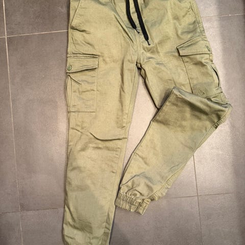 Fine pent brukte cargobukser med snor og masse stretch. Olivengrønn. Small. Carlings.
