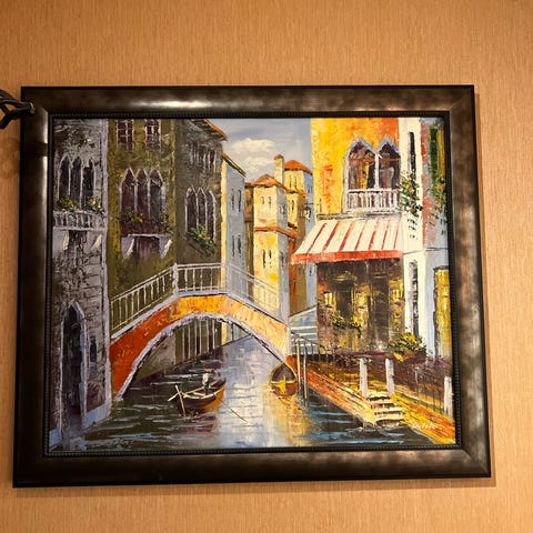 Oljemaleri som viser en kanal i Venezia med gondol og bygninger. Maleriet har en ramme med noen mindre skader. Signert og datert 1946