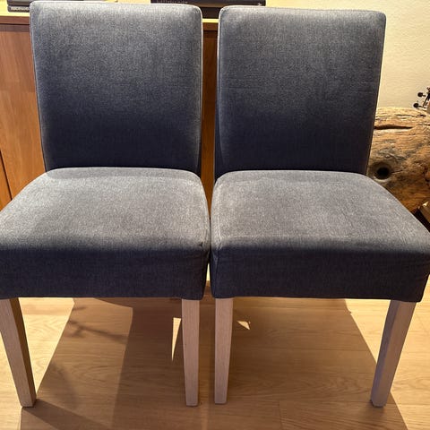 Selger våre spisestuestoler som er godt, men pent brukt. Det er 8 stk. med brunt trekk. Litt usikker om de er i eik, men beina er i den fargen.