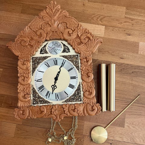 Gulvur lagd og dekorert av slektning ca år 2000 malt innvendig i blågrønn farge, utvendig i bonderød farge og grønn. Urverket er i orden. Ingen skader på trekassa. Selges pga flytting.