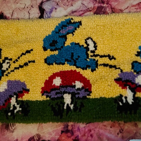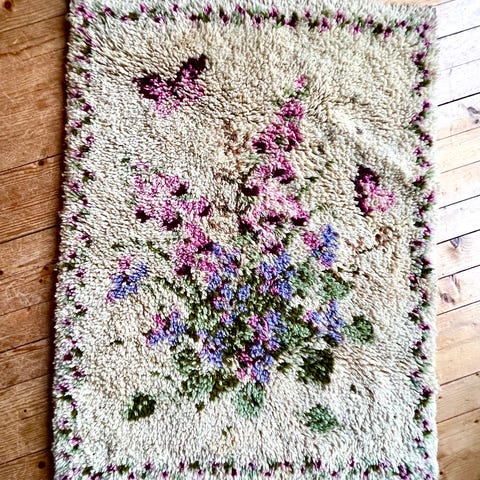 Hærlig ullteppe fra 60 tallet. Dusne fine farger. Helt og pent (en flekk lite synlig, se bilde) Perfekt for redesign til puter/jakker/ vester osv, se bilder som illustrerer
