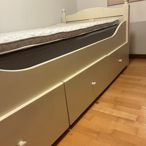 IKEA madrass med målene 80x200 cm og kan settes sammen til dobbelt seng.Madrassene er brukt med tykk overmadrass. Føtter i hvit stål