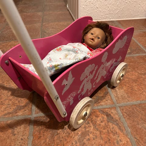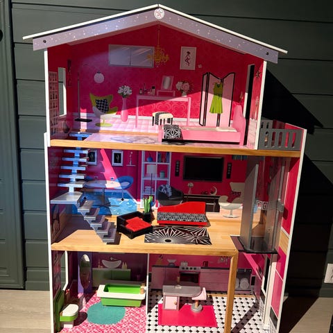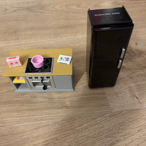 Kjøkkenet er selve hjertet i huset! Innred dukkehuset med en elegant, grå kjøkkenøy med detaljer av tre, samt et nydelig sort kjøleskap. Kjøkkenøyen har batteridrevet LED-belysning, skap og skuffer som kan åpnes og lukkes, samt en utfellbar benkeplate. Hvor på kjøkkenet synes du kjøkkenøyen passer? Lampen tennes med et enkelt klikk på den lille knappen på kjøkkenbenken og slukkes automatisk etter 15 minutter. Gryte, kjøkkenredskaper, kokebøker og matvarer medfølger. Batteri (CR2032) følger ikke med.