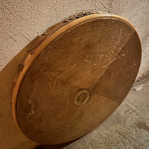 Et lite bord gis bord gis bort mot at det hentes. Bordplaten kan "brettes» til dobbel størrelse som på siste bilde. Hengslene til å brette bordet ut er knekt, så de må skiftes ut- har selv brukt bordet fint som det er. Noen fliser/sprekker i sidene.