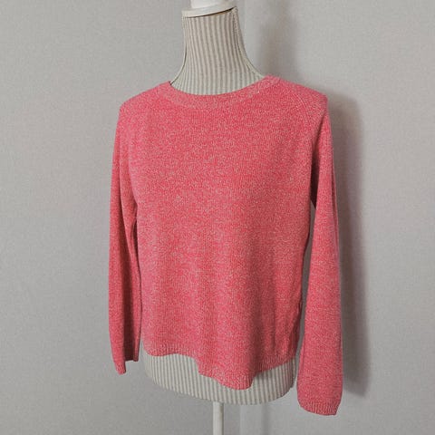 Myk og helt kløfri genser i elastisk strikk. Mørk brun med lysere parti rundt hals og kant nede, veldig fin. Den er strikket i to "lag", og det øverste laget ser jeg nå at har fått et bittelitt hull i seg, se bilde. Kan nok settes et bittelite sting i, så vil det ikke være synlig. Lett boxy fasong.