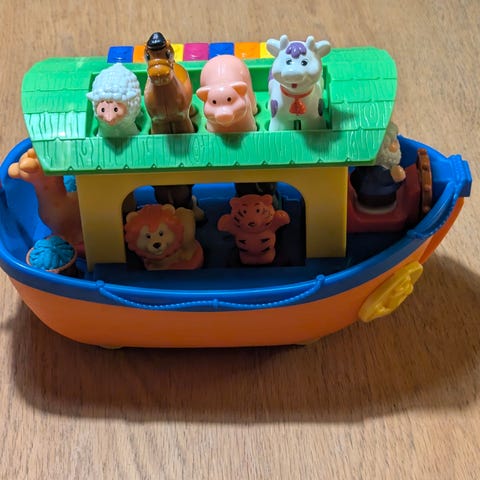 Jeg rydder unna på loftet og selger derfor Noas ark. Den har ligget pakket ned i noen år, uten batteri. Jeg testet den idag og den fungerer som den skal! Man kan spille piano på taket og dyrene lager lyder når man trykker på man setter de på plassen sin.