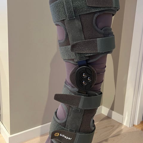 Selger en lite brukt kneskinne av god kvalitet strl S/M. Kneskinnen gir stabil og trygg støtte ved ulike typer kneskader. Jeg har selv brukt den i forbindelse med sidebåndskade.