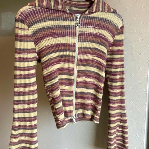 Superfin og unik vintage cardigan /ullgenser fra tidlig 2000-tallet med dobbel glidelås/zip i søte farger og 100% ull. Laget i Italia. Fått i gave, men dessverre for trang til meg som bruker M. Den vil passe S og XS. Jeg opplever den som litt kort, men ikke cropped. Typisk Y2K stil og passform.