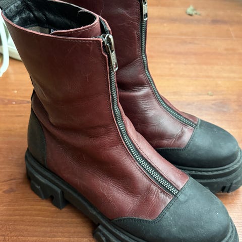 Roots støvler i størrelse 36. Støvlene har glidelås foran og en kraftig såle. Fargen er mørk, med en kombinasjon av svart og burgunder. Brukt litt en gang