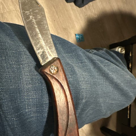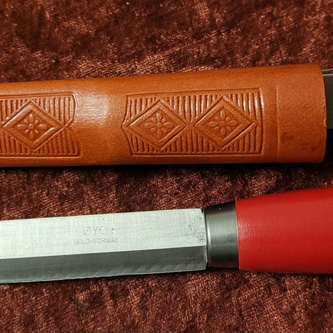 Kniv med blad i rustfritt stål, trehåndtak og medfølgende lærslire. Egnet til friluftsliv og generell bruk.