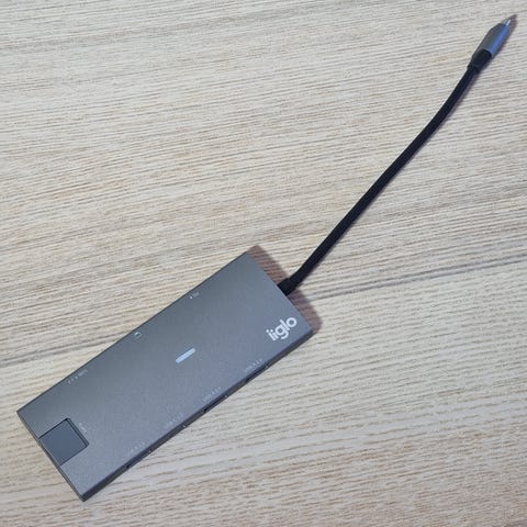 Iglo Adapter USB-C til flere porter med kompakt design og grå farge. Adapteren muliggjør tilkobling av flere enheter via USB-C-porten.