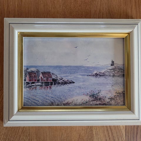 4 vakre bilder med motiv fra Slottsfjellet, Nordbyen og Brygga i Tønsberg, samt Hvalfangstmonumentet i Sandefjord. Hvert bilde er innrammet med svart ramme og hvit passepartout.