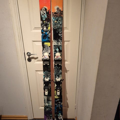 Twintip ski K2 Juvy 119cm med fargerikt design. Skiene har integrerte bindinger og passer for barn eller junior bruk.