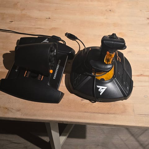 Thrustmaster T-Flight Hotas X joystick med flere knapper og kontrollfunksjoner. Designet for bruk med flysimulatorer og andre spill som krever presis kontroll. Joysticken har en base med flere funksjonstaster og en håndkontroll som gir god ergonomi.