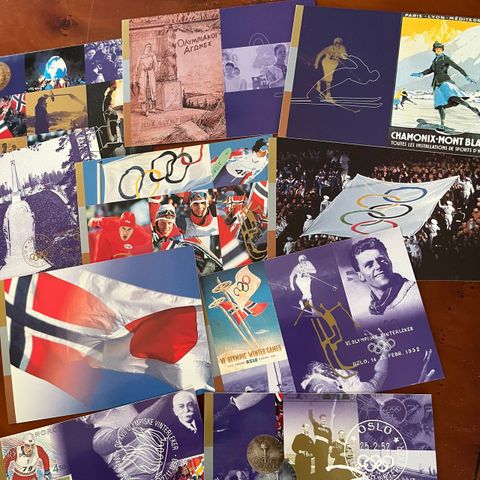 Norsk Olympisk Museum samleralbum med tilhørende brosjyrer og dokumenter relatert til olympiske leker. Inneholder informasjon og bilder knyttet til OL-arrangementer og historie.