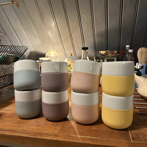 Sjarmerende selvplukka frokostsett, 6 Lucie Kaas frokostfat fra MILK-kolleksjonen i opalglass og 6 krus fra Royal Coepnhagen fra serien Riflet Contrast. Lyserosa, lyseblå og lilla, 2 kopper og 2 fat per farge. Alt ble kjøpt for ca. 6 år siden til originalpriser og brukt vanlig. Fatene har vanlige bruksmerker, koppene ser nye ut.