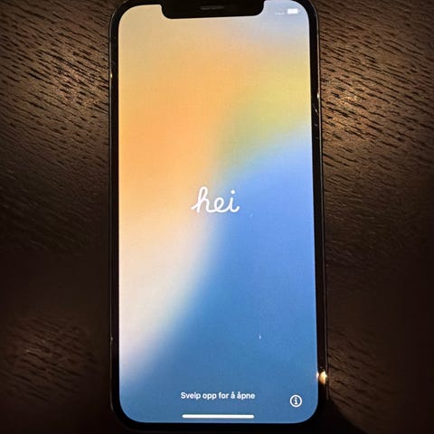 Apple iPhone 12 64 GB mobiltelefon i hvit farge. Enheten har 64 GB lagringsplass. Batterikapasiteten er målt til 100 %